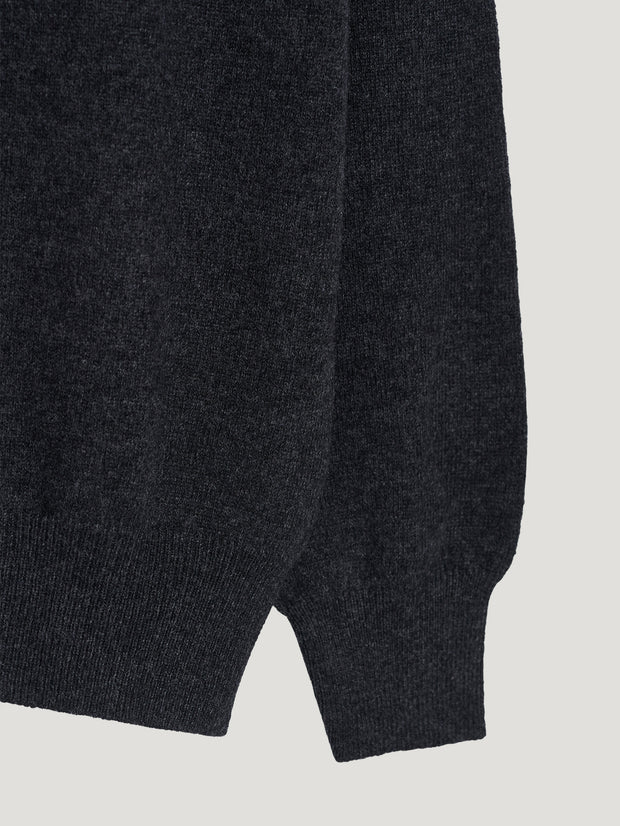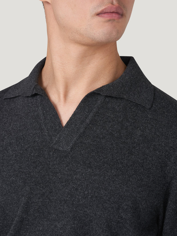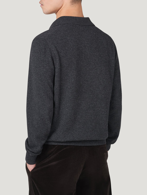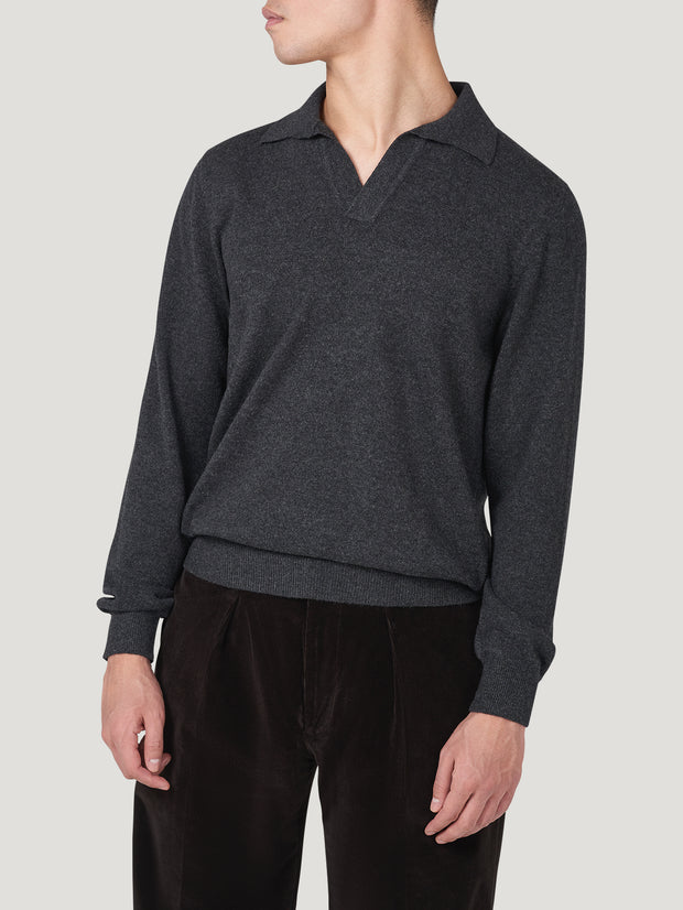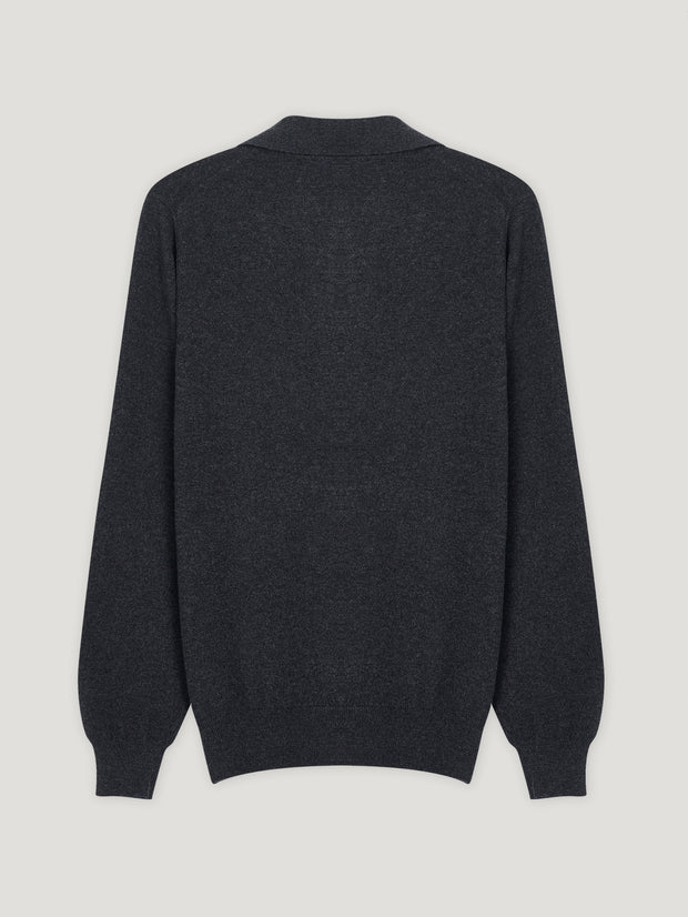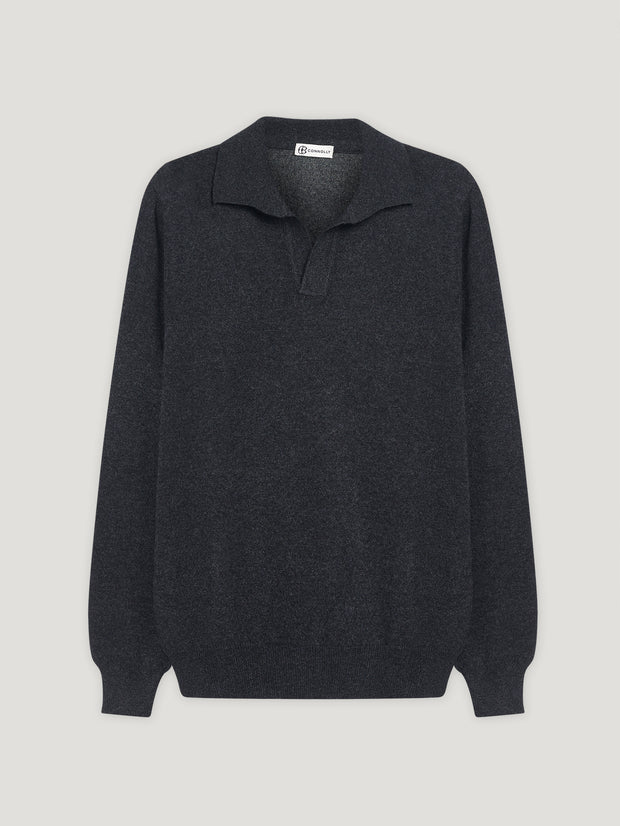 Made from soft lightweight cashmere the open collar polo is in a beautiful anthracite grey colour. The polo sweater has a dropped shoulder and is made from 1ply 12 gauge cashmere.