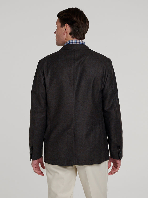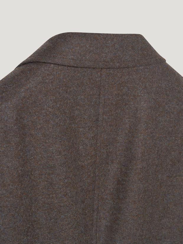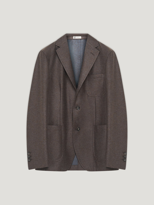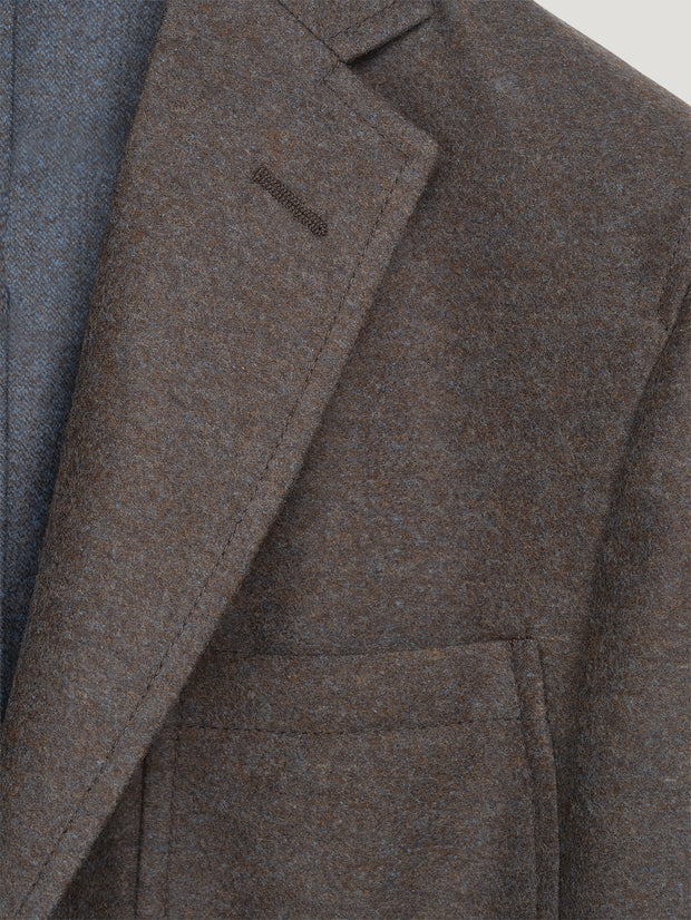 The classic Connolly Delon Jacket, redesigned for the season in a double faced wool flannel. An unstructured sports jacket, it effortlessly complements any build. The jacket is unlined for an effortless drape, making it the perfect piece for any occasion, easy to wear for both elevated or laid back styles. The warm brown tones are complemented by a beautiful blue undertone in the flannel. The jacket features a two-button closure, a back vent for ease of movement and three external pockets, two at the hip and one breast pocket.