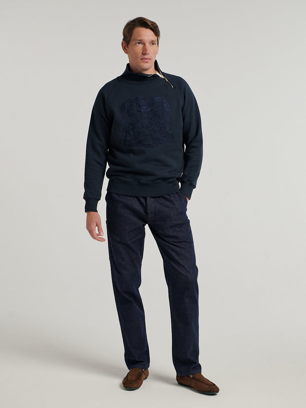 We have taken the Connolly Crest and re-imagined as an embroidery on our iconic Driving Sweatshirt. Working with renowned embroiderers, based also in Mayfair around the corner from our shop and serving the Saville Row area for decades. The embroidered crest thread is tonally matched to the sweatshirts, giving a matt/shine look and we enlarged the scale to be impactful and see the detail of the rampant cows, and especially the Latin writing along the lower banner which means ‘nothing compares to leather’.