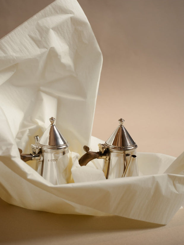 From the renowned silversmiths, Thomas Bradbury & Sons, a pair of café-au-lait pots in sterling silver.