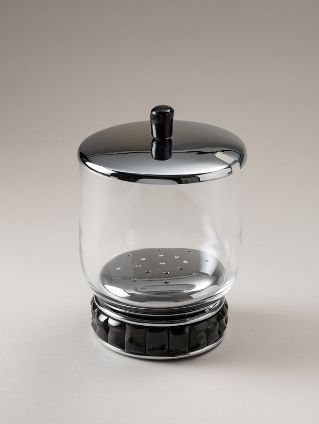 A refined addition to the drinks service. Made of blown glass, with cover in chromed brass, it is made unique by the precious handcrafted oryx antler details. The lid is designed to perfectly hold the matching ice tongs, while on the bottom a plate in pierced chromed brass allows the filtering of the water while keeping it separated from the ice.