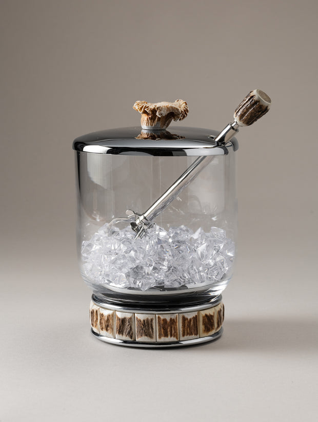 A refined addition to the drinks service. Made of blown glass, with cover in chromed brass, it is made unique by the precious handcrafted deer antler details. The lid is designed to perfectly hold the matching ice tongs, while on the bottom a plate in pierced chromed brass allows the filtering of the water while keeping it separated from the ice.